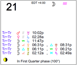 Summary: . The Moon is in Aquarius all day (until October 23rd, at 1:17 AM). The Moon is waxing and in its First Quarter phase. A First Quarter Moon occurred yesterday, and a Full … [Read more...]
